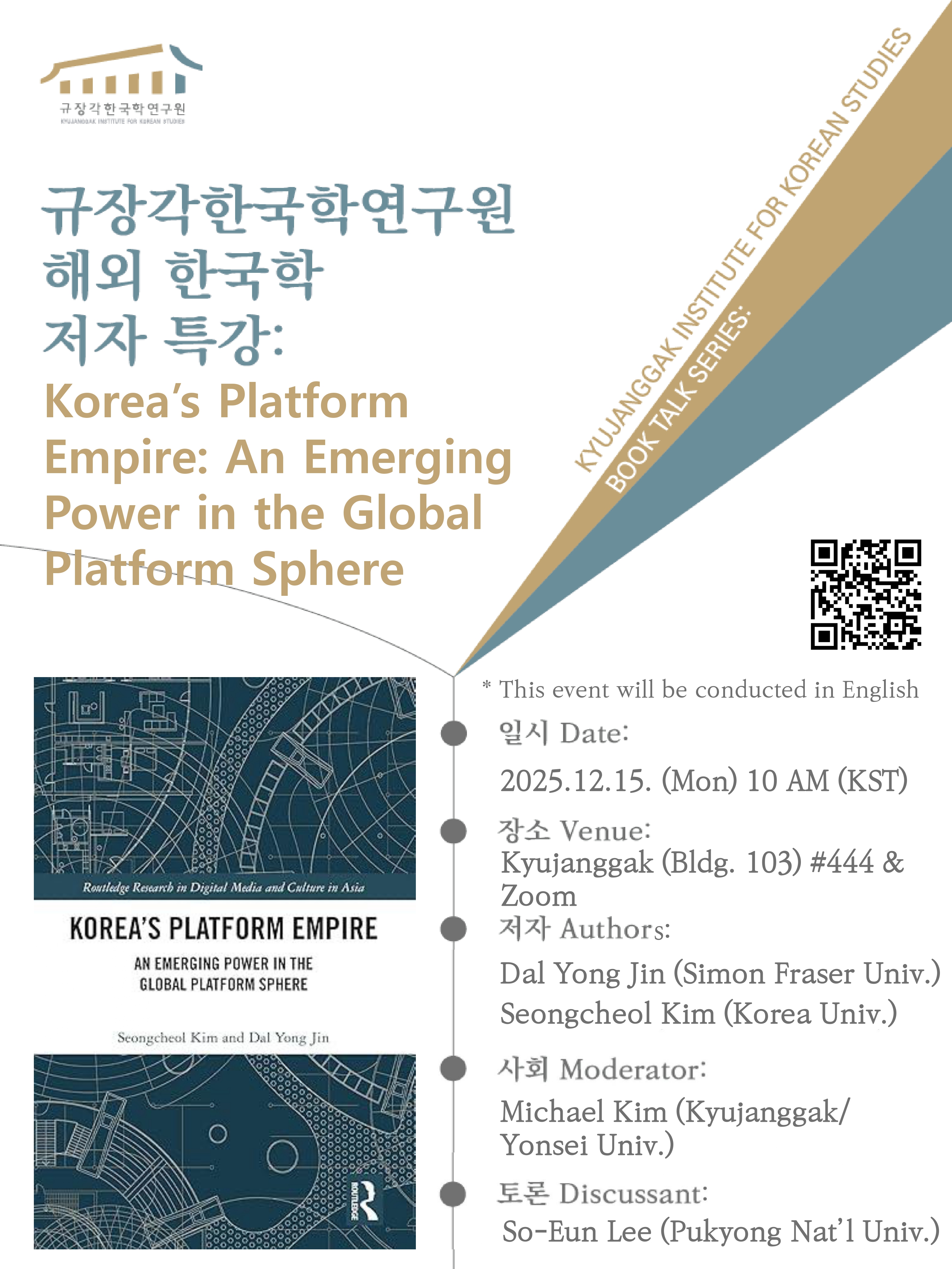 The International Center for Korean Studies of Kyujanggak Institute is hosting a Book Talk series, introducing Korea’s Platform Empire: An Emerging Power in the Global Platform Sphere.