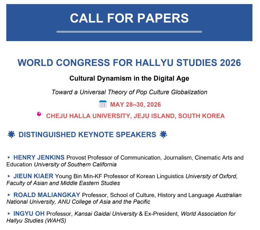 [KS] [WAHS] Call for Paper : The 12th World Congress for Hallyu Studies, 2026.05.28~30, Cheju Halla University.